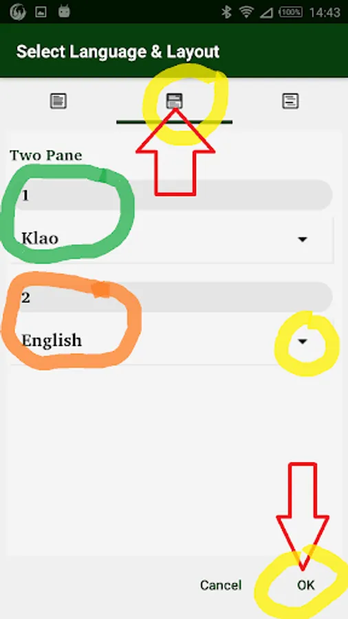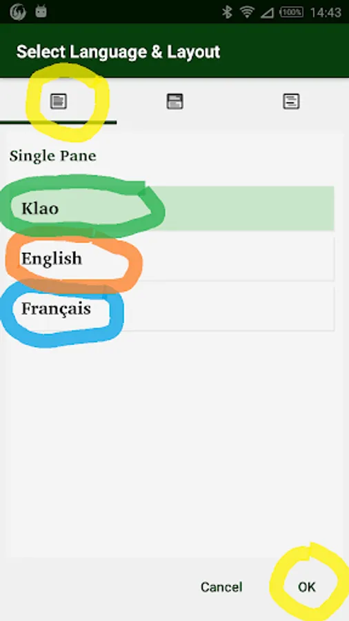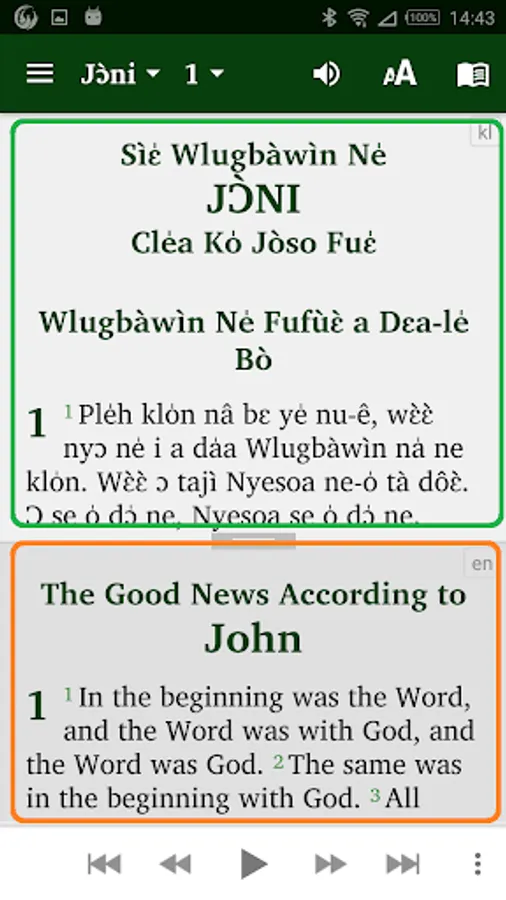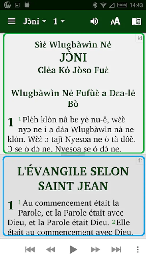- «verset par verset» pour afficher un verset en Klao suivi du même verset en français ou en anglais.