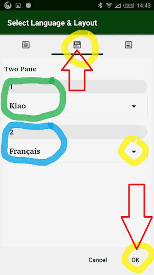 - "two panes" to display the Klao at the top and the French or English version at the bottom