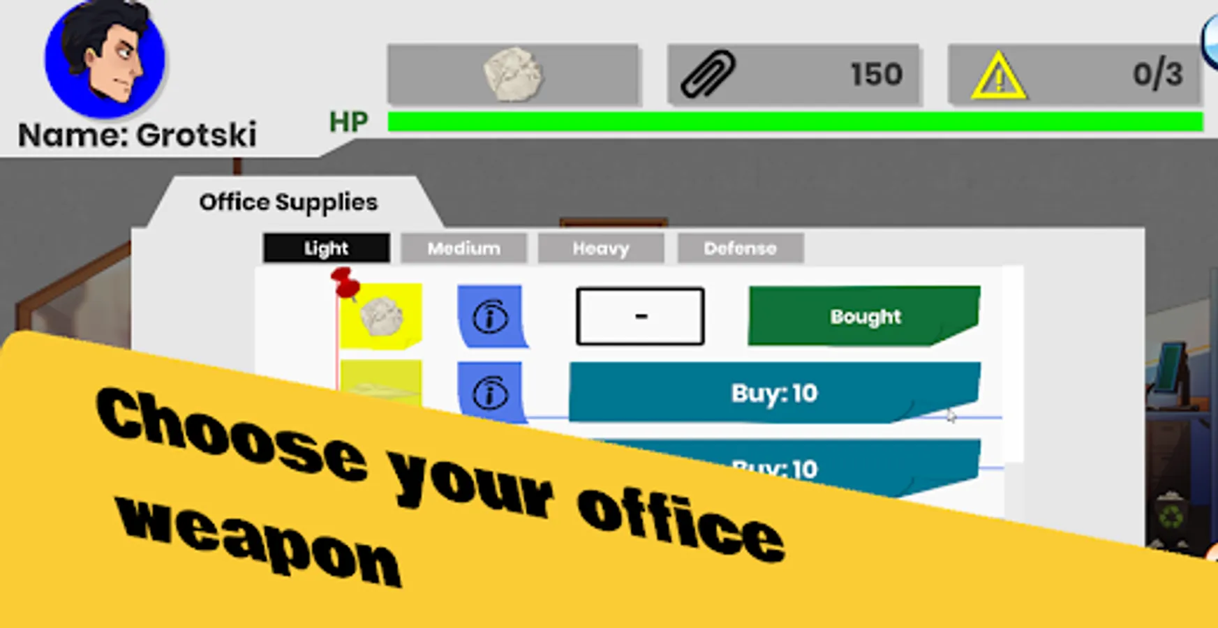 Earn paperclips by hitting your opponent with weapons like a paper ball, paper plane, coffee mug, and even a file cabinet. Use the store to spend your hard earned paperclips on awesome office Supplies that can do serious damage.