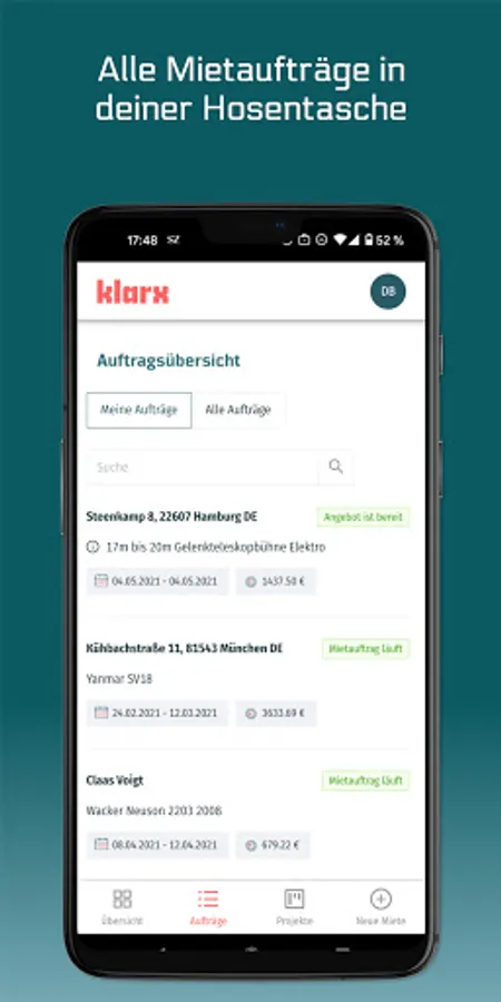 You want to be able to choose from thousands of different construction machines across Germany and have them delivered to you on the construction site with just a few clicks? Then get the klarx app now!