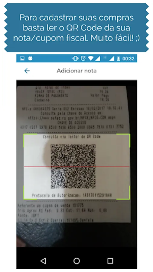 To register your purchases, just scan the QR Code of your invoice with the Economiza Club application. That's it, you don't have to type anything.