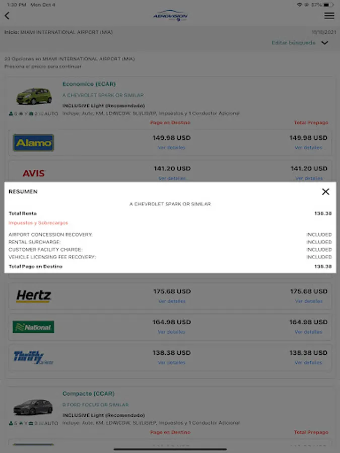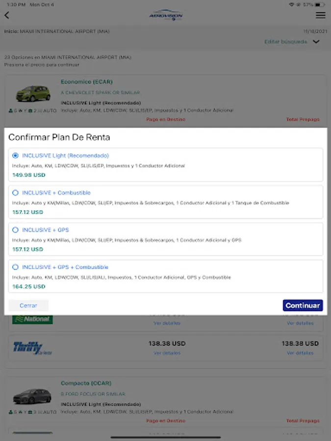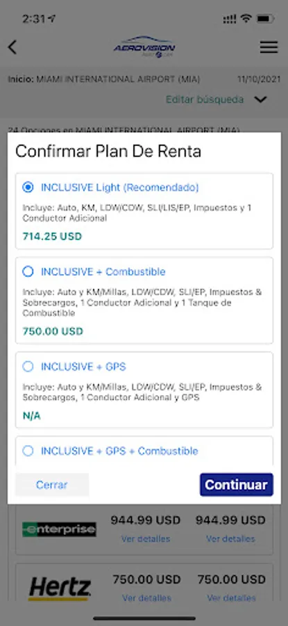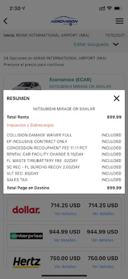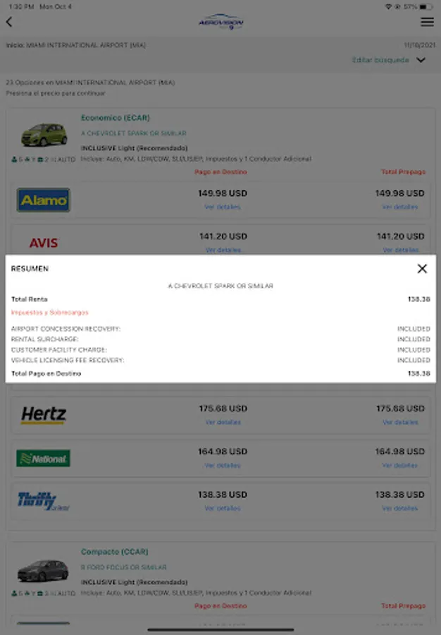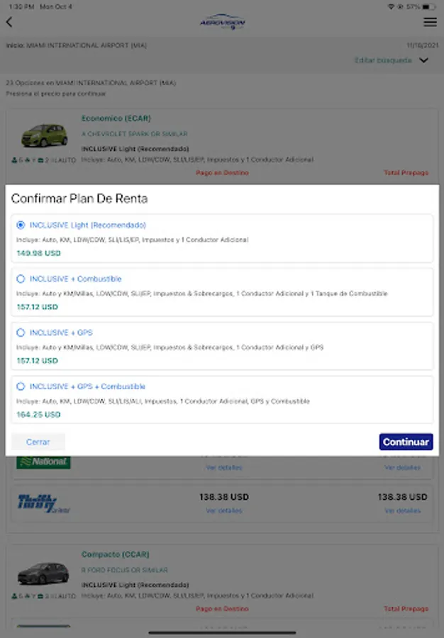 The initial search is processed and displayed with the most popular rental plan of the moment. In the description of the car, the products included in the rate are explained such as: Car and miles, collision and theft protection (LDW / CDW), supplemental liability insurance (SLI), Local Taxes and Surcharges, etc. These inclusivities vary according to the rental plan requested. This plan can be updated by clicking on the "Edit Search" option.