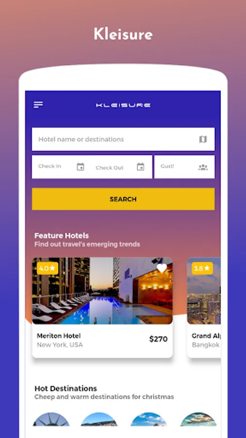 Kleisure is a Flutter hotel booking mobile application theme, compatible in both IOS and Android. This UI theme is highly flexible design and it is fully optimised and modernised. Our UI theme empowers you to add different hotels, its special features and amenities, it enables different list and filters based on its features and amenities, allows users to view the hotels near them, choose them based on different list, filters and book hotels suits their needs and budget.
