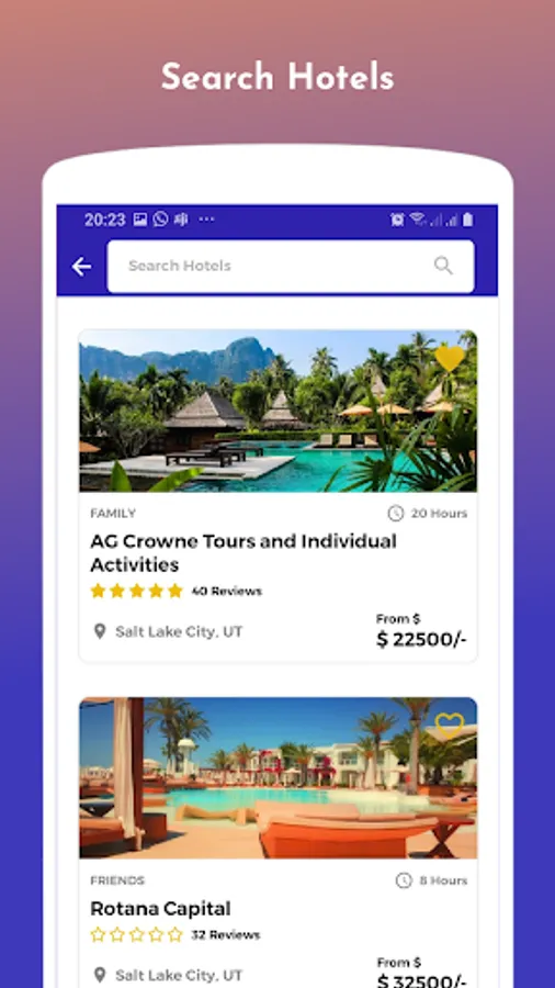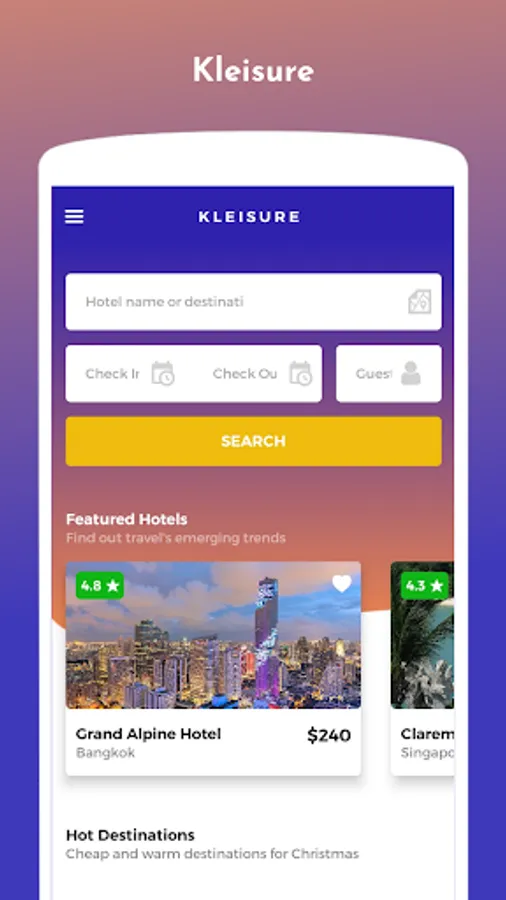 Kleisure is a React Native hotel booking mobile application theme, compatible in both IOS and Android. This UI theme is highly flexible design and it is fully optimised and modernised. Our UI theme empowers you to add different hotels, its special features and amenities, it enables different list and filters based on its features and amenities, allows users to view the hotels near them, choose them based on different list, filters and book hotels suits their needs and budget.