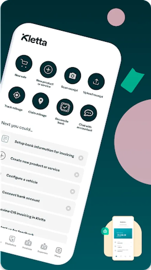 Kletta app features include send & track invoices on-the-go, accept card payments, scan & attach receipts, track & claim mileage, reconcile bank transactions, see real time tax estimates and have overall visibility of your finances.