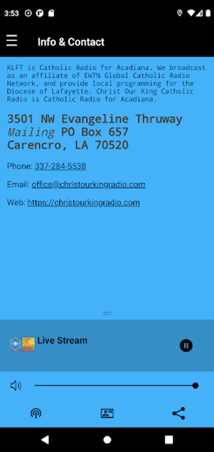 The Mission of our Apostolate Christ Our King Communications Apostolate endeavors to answer Christ’s call to evangelize. We will do this through the mediums of radio, internet, and Digital TV Channel 50.5. We broadcast as an affiliate of the EWTN Global Catholic Radio Network and provide local programming featuring Religious and laity within the Diocese of Lafayette. Additionally, we provide services to our Bishop, churches, Catholic Schools, and other 501(C)(3)nonprofit humanitarian organizations by providing broadcast and visual announcements at no cost.