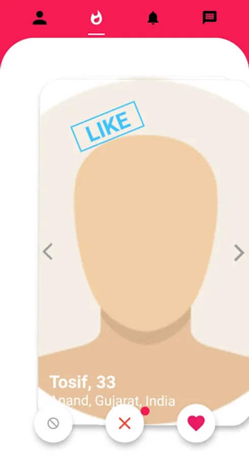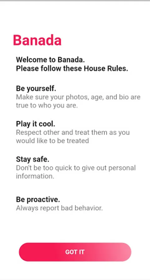 Banada dating application allows users to anonymously swipe right to like or left to dislike any profiles based on their photos, age, or common interests. Once the users are matched they can start messaging each other and use other features.
