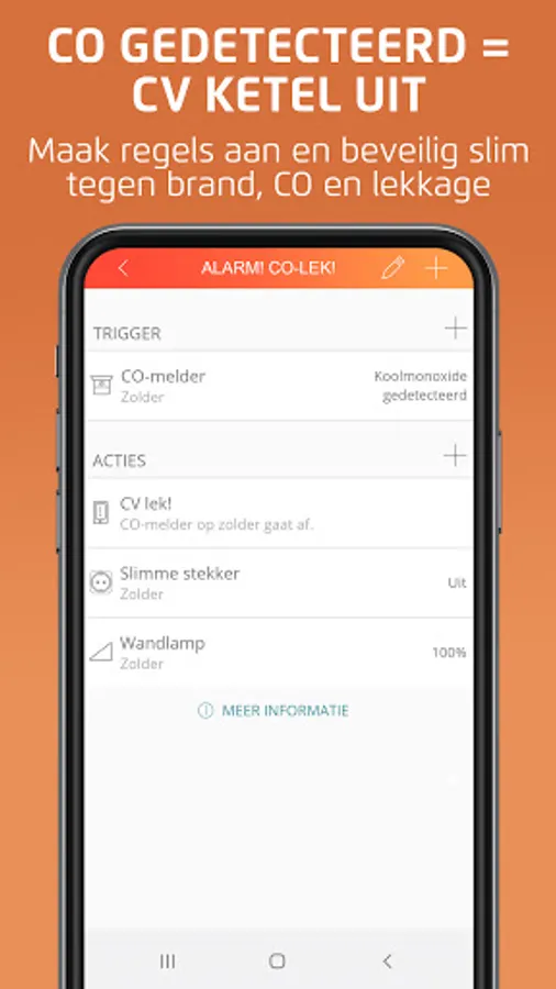 Or use rules to have actions performed on a specific trigger. For example, automatically switch off the boiler as soon as the carbon monoxide detector goes off, the doorbell rings when there is movement or the light switches on when a window is opened.