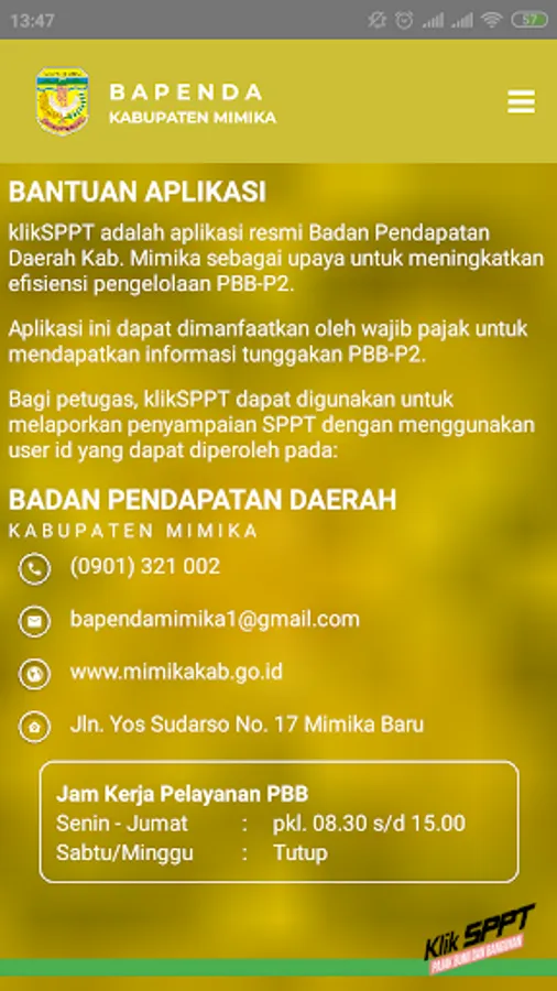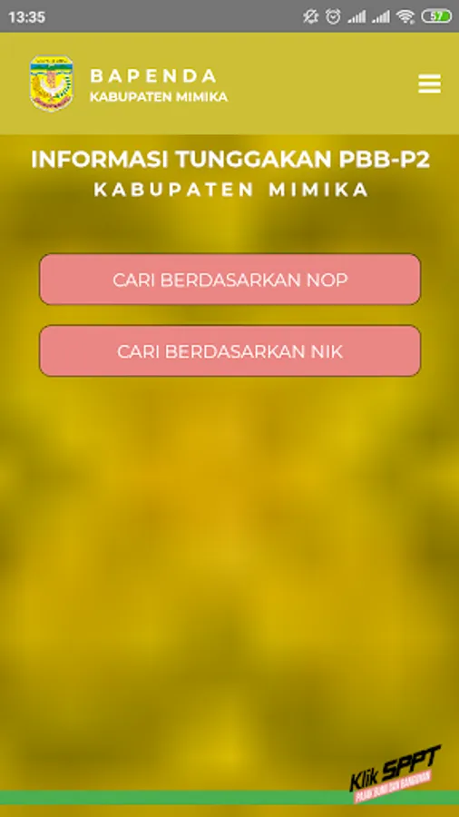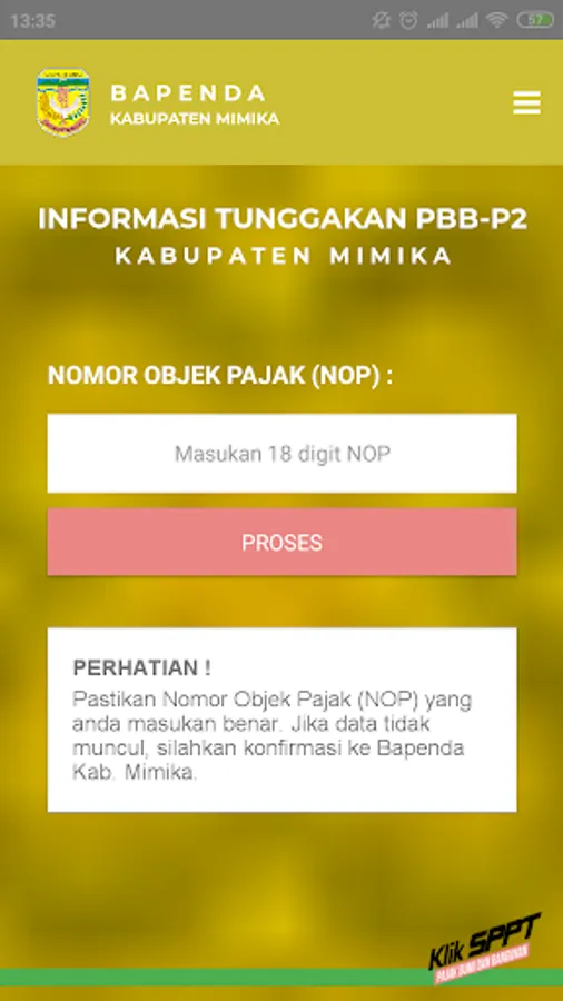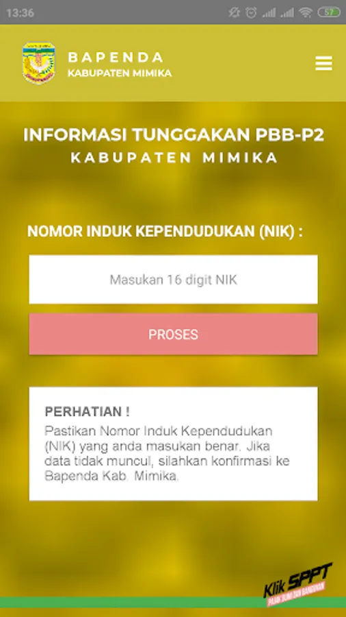 Klik-SPPT is the official application of the District Revenue Agency. Mimika containing information on PBB-P2 arrears in Mimika Regency and submission of SPPT PBB-P2. This application can be used for taxpayers who want to know the amount of PBB-P2 arrears in Mimika Regency and officers who will carry out the submission of SPPT to taxpayers. To get the Officer's User ID, please contact the Mimika Regency Regional Revenue Agency