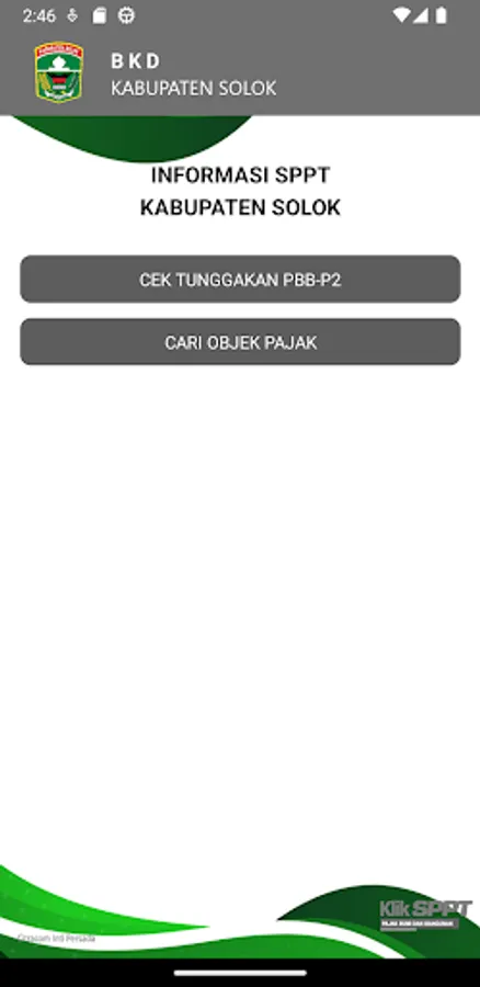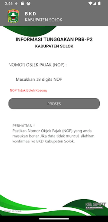KlikSPPT is the official application from the Solok Regency Regional Finance Agency which contains information on PBB-P2 arrears in Solok Regency and submission of SPPT PBB-P2. This application can be used for taxpayers who want to know the amount of PBB-P2 arrears in Solok Regency and officers who will carry out the submission of SPPT to taxpayers. To get the Officer's User ID, please contact the Solok Regency Regional Finance Office