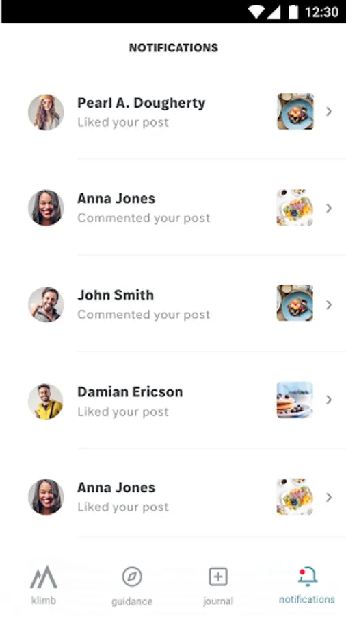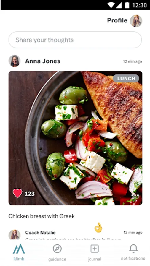 • Don’t worry about counting calories. Just snap a photo of your meal with the Klimb app and await your coach’s comments.