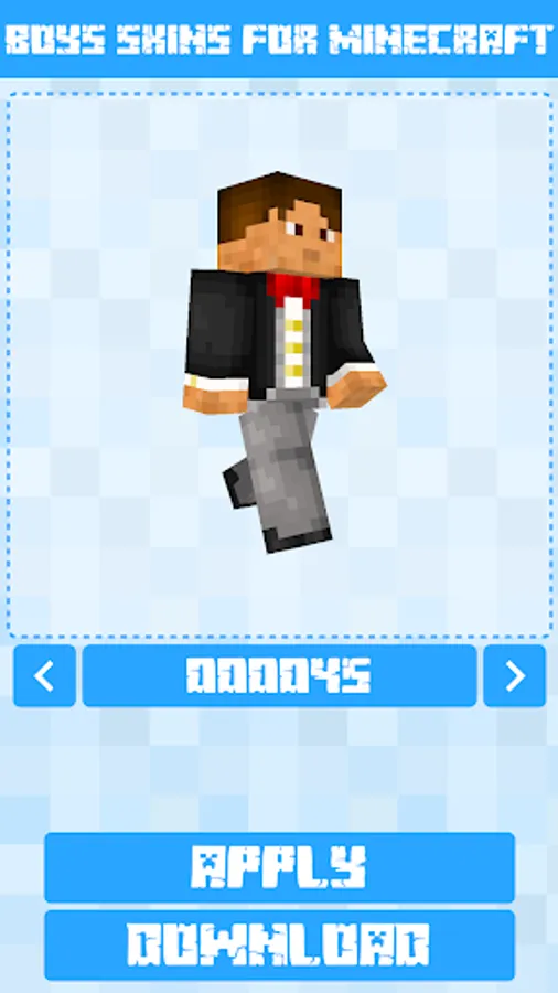 Boys Skins for Minecraft PE is not developed by Mojang. This application is not affiliated in any way with Mojang AB. Minecraft is a trademark of Mojang AB. The Minecraft Name, the Minecraft Brand and the Minecraft Assets are all property of Mojang AB or their respectful owner. We adhere to the terms set out by Mojang AB at https://www.minecraft.net/terms