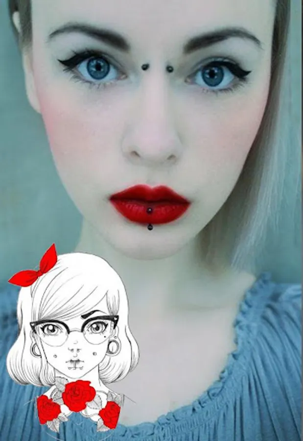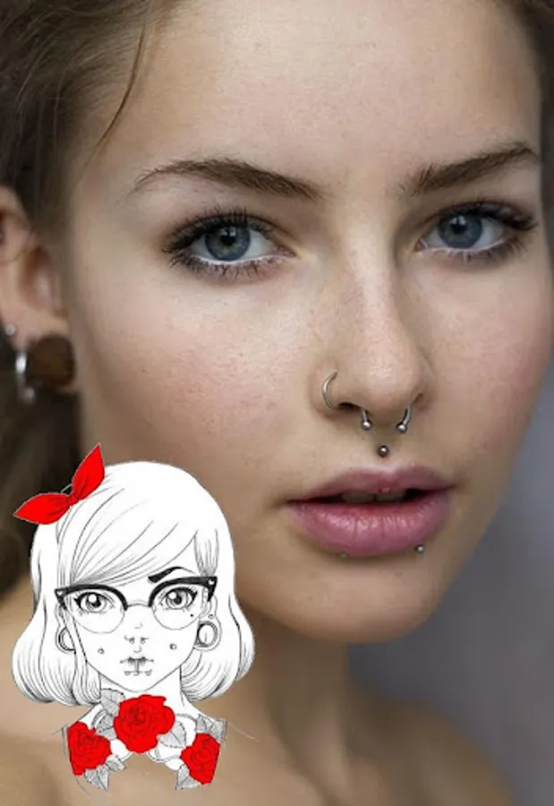 Put one on the lips or cheek, or the eyebrows and see how you look with them. If you prefer when it is discrete, maybe a nose stud piercing is the best one for you? Try all of them one by one to unlimited fun with this tattoo and piercing photo editor application.