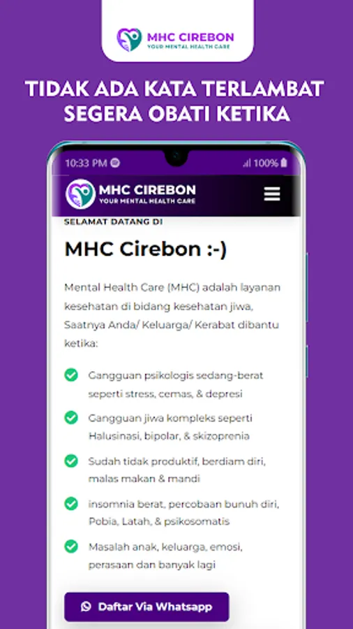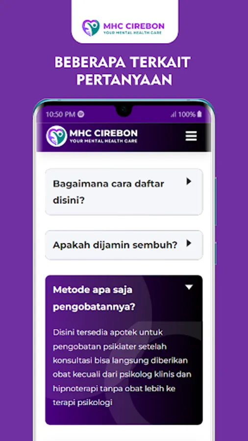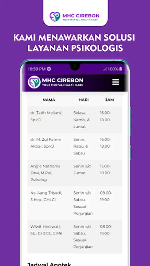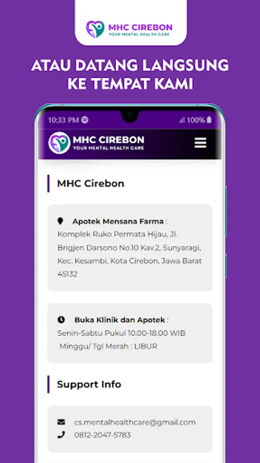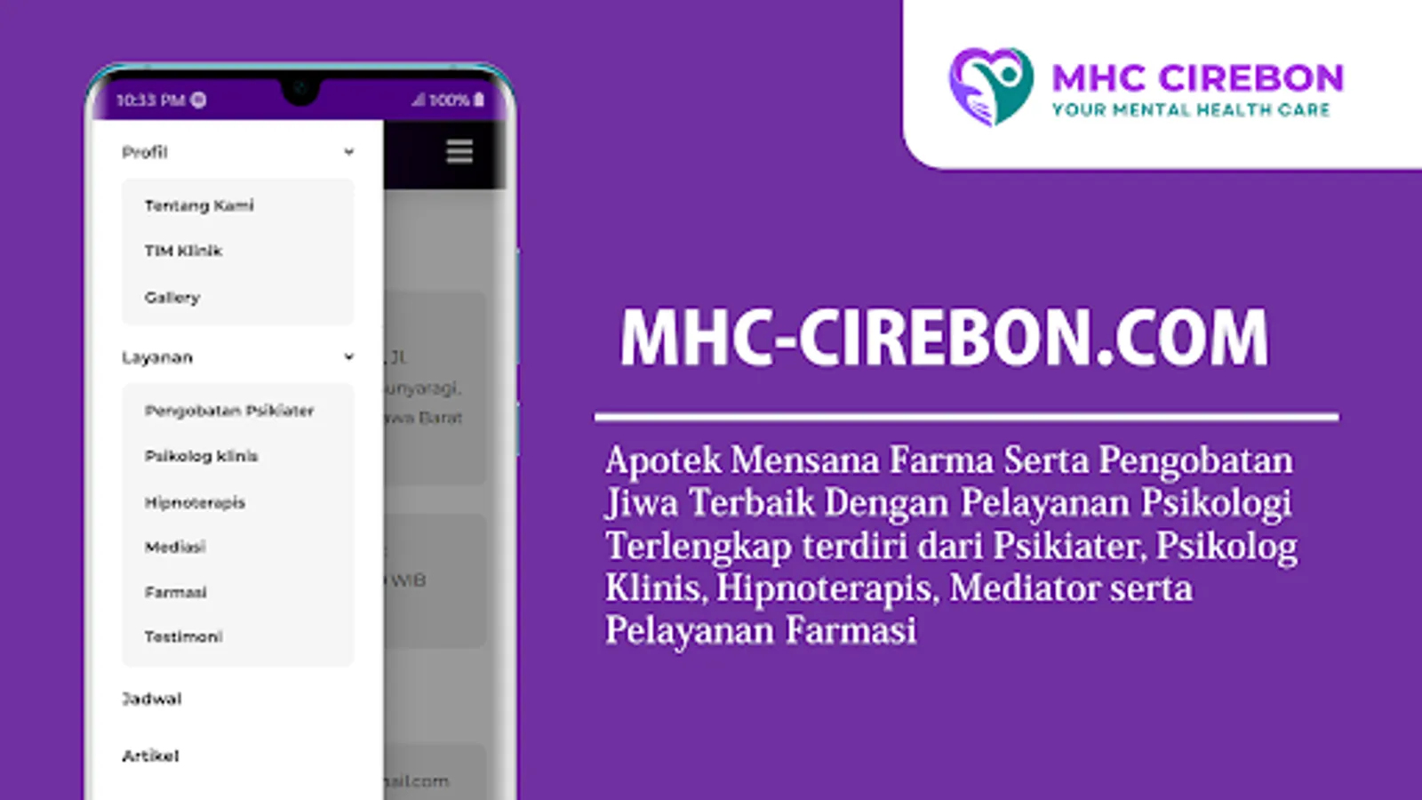 MHC Cirebon consists of: Mensana Farma Pharmacy As well as the Best Mental Medicine with Complete Psychological Services consisting of Psychiatrists, Clinical Psychologists, Hypnotherapists, Mediators and Pharmacy Services in Cirebon, Indramayu, Majalengka, Kuningan, Brebes & Tegal.
