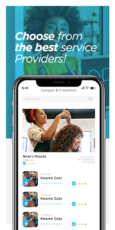 . Choose your most preferred service provider from our “freelancers near you” feature or use the “connect” feature to search for a shop and make a booking request, whether “in-house” or “out-house booking”
