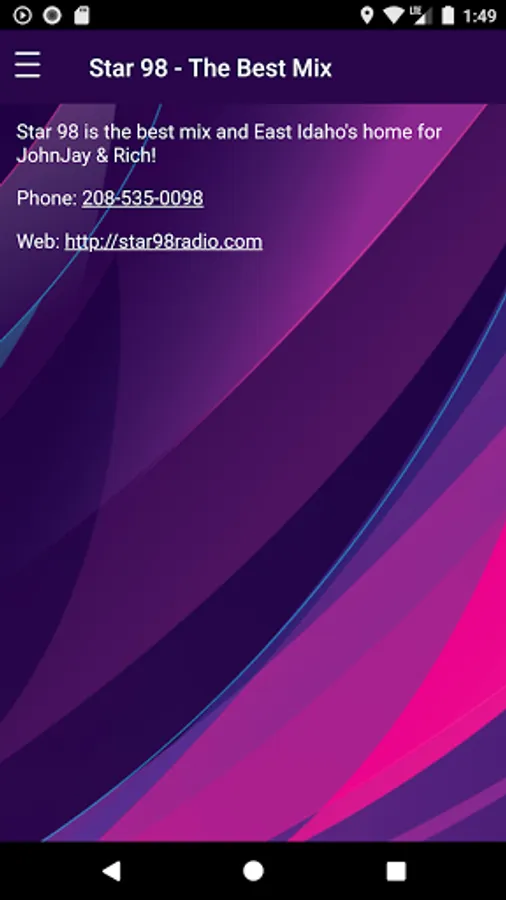 Star 98 is always looking for ways to make it even easier for you to take us along when you are on the go! Here you can listen to Today’s Best Mix all day no matter where you are! - See current and recently played songs and up to date station and local news on a single screen. - Wake up to Johnjay & Rich with our built in alarm clock. - Fall asleep while listening to your favorite station. - Real time weather for where you are. - Share our app via Facebook, Twitter, and e-mail.