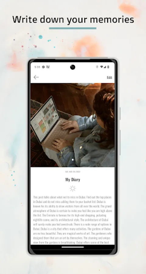 - Easy to use: Create your diary including photos, videos and text with just one click