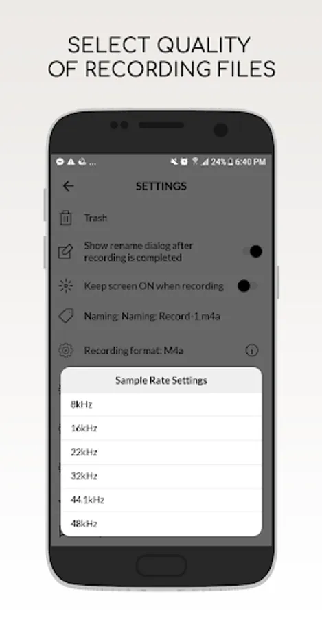 ⚡ Adjustable sample rate from phone quality (8 kHz) up to CD quality (48 kHz).