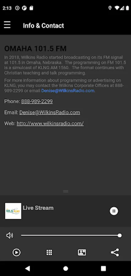 Local Christian teaching and preaching programming for Omaha, Nebraska. In 2018, Wilkins Radio started broadcasting on its FM signal at 101.5 in Omaha, Nebraska. The programming on FM 101.5 is a simulcast of KLNG AM 1560. The format continues with Christian teaching and talk programming.