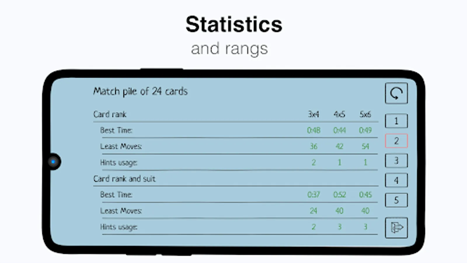 3) You can set the number of cards in the deck and the type of game, the more cards in the deck, the more difficult and longer the game is. The quick round is handy for light memory training.