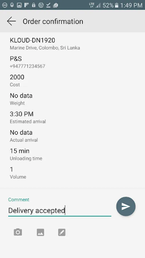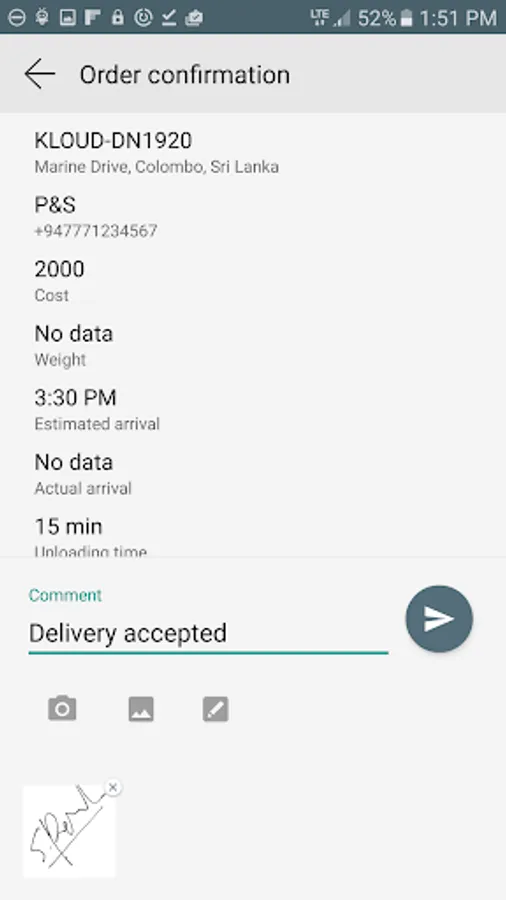 - confirm delivery by attaching a photo with customer signature to an order with data on customer name, delivery time and date indicated on a photo;