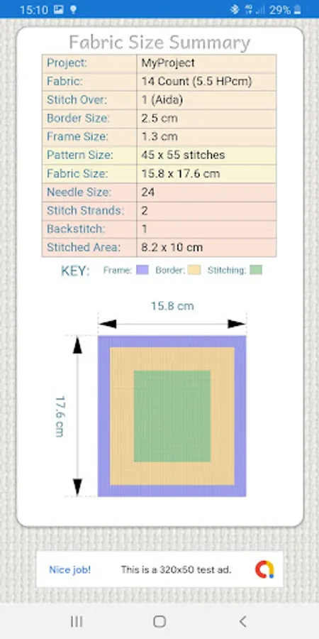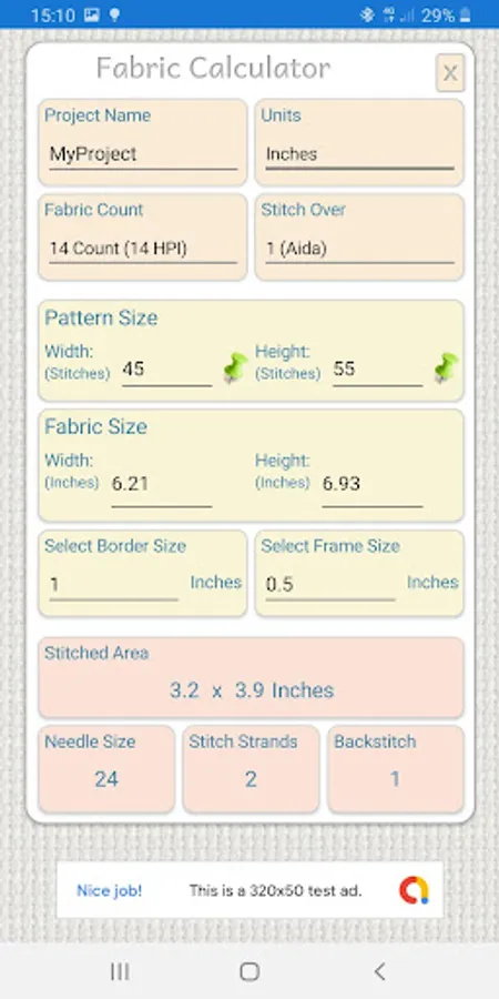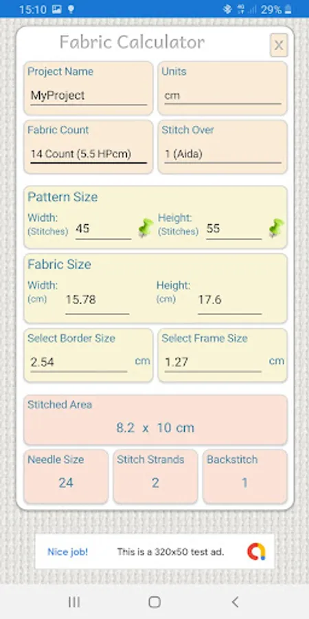 Borders or frames can be optionally added, and it's simple to change the stitch count or units. Multiple units are supported, including Inches, cm, mm, Feet and Metres.
