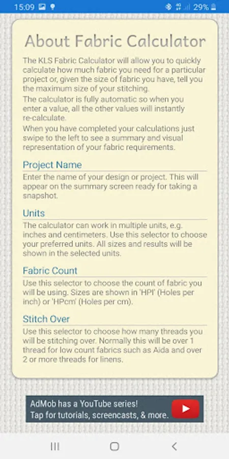 The KLS Fabric Calculator will allow you to quickly calculate how much fabric you need for a particular project or, given the size of fabric you have, tell you the maximum size of your stitching. The calculator is fully automatic so when you enter a value, all the other values will instantly re-calculate. When you have completed your calculations just swipe to the left to see a summary and visual representation of your fabric requirements.