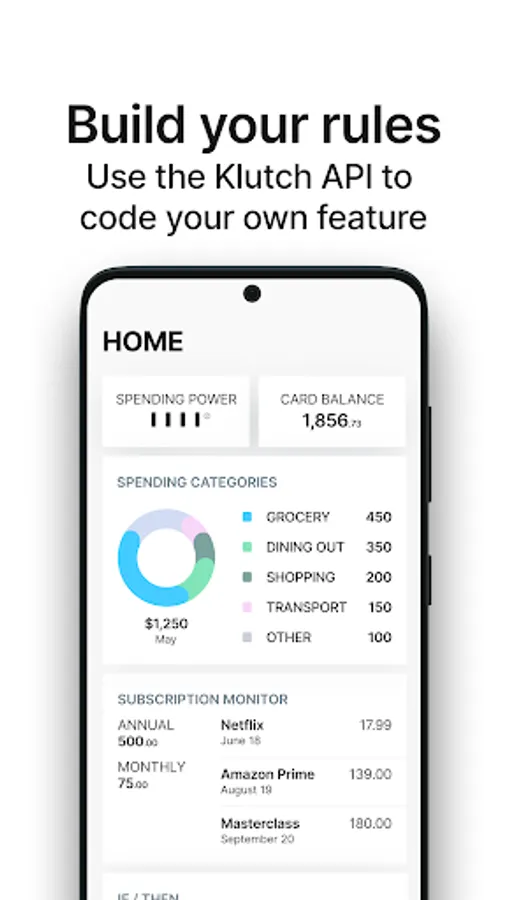 Use the Klutch App to automate your finances and life, save and spend smarter. Install the features you like to make Klutch work for you. New features are added every week. Features created by the Klutch team are all open source.