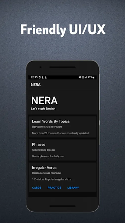 NERA is an interactive English vocabulary learning app. It comes with an easy-to-use interface and allows you to learn English words and expressions and repeat them in a playful way. The application supports a variety of functions, such as searching by topic, learning words by category, and testing knowledge. All words and expressions are illustrated with examples and also reflect current English trends. NERA is a simple and intuitive app that will help you get the most out of learning English.