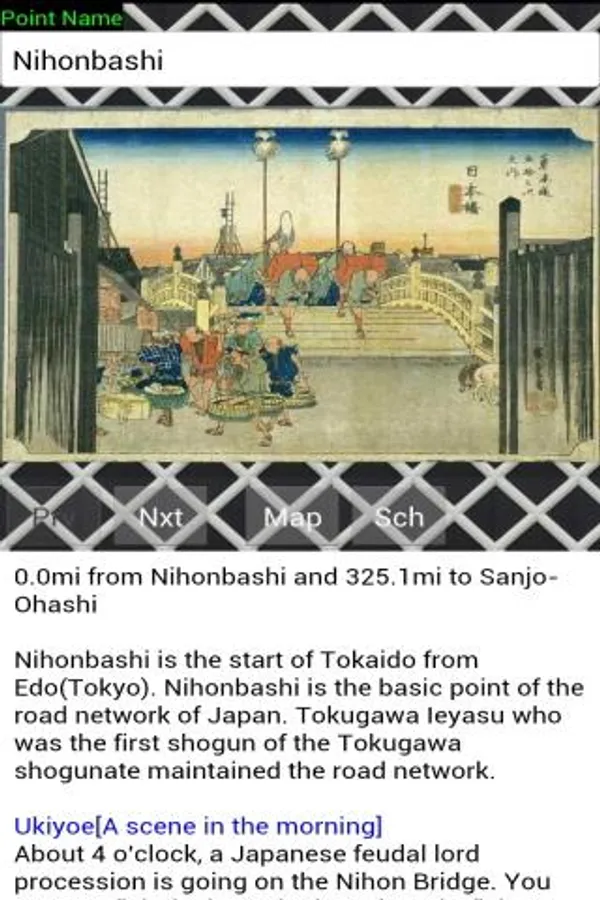 'Tokaido 53 (Journey to Kyoto)' is a exercise-support application. This app is the sample version.You can take a journey from Edo to Kyoto on 'Tokaido' according to the distance that you walk or run for. The distance between Edo and Kyoto is about 500 km (300 miles). 'Tokaido' was the important road linked Edo and Kyoto and a lot of people traveled in the Edo period. It is said that people in those days took about 2 weeks to travel from Edo to Kyoto. There were 53 station towns in Tokaido, and the Japanese famous painter, Ando Hiroshige, painted 55 pieces of Tokaido(Nihonbashi in Edo,Sanjo-Ohashi in Kyoto and 53 station towns). You can see his picture of the station town, when you arrive at the station town. And also, You can enjoy '36 sceneries of Mt. Fuji' painted by another famous painter, Katsushika Hokusai.