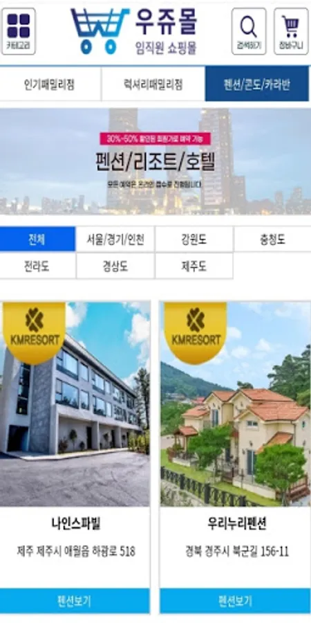 Resort including shopping, hotels, caravans, glamping, various leisure facilities, health check-ups, overseas travel, cruises, Jeju Island packages, etc.