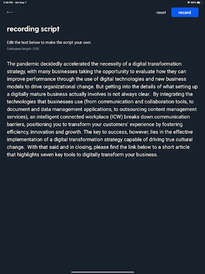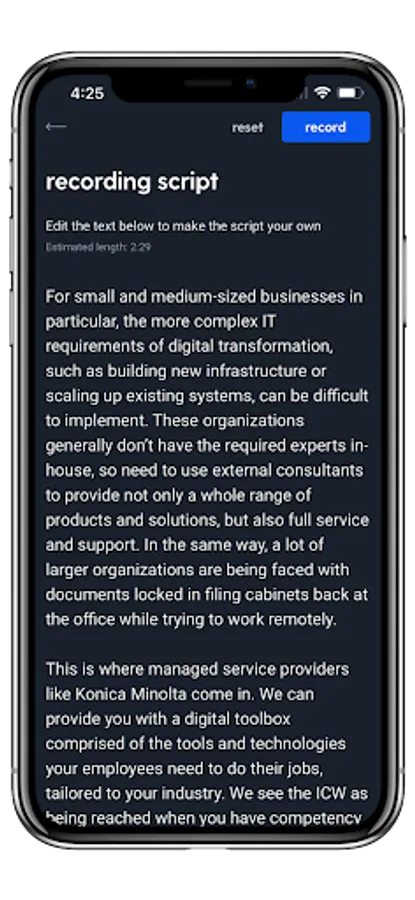 With a proprietary, built-in teleprompter, the KM100VIDEO companion app makes it easy to record short videos on mobile phones or tablets. This app also provides access to industry-specific, best class video scripts, which pair directly to the proprietary teleprompter. Users can also create their own custom video scripts from scratch and record immediately.