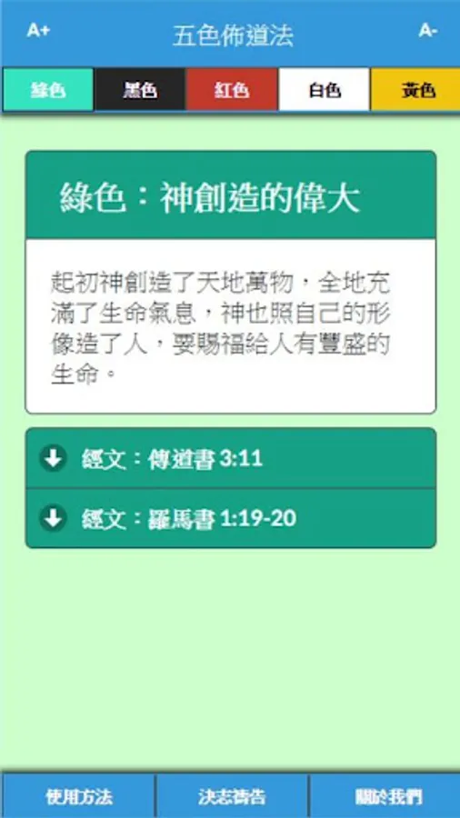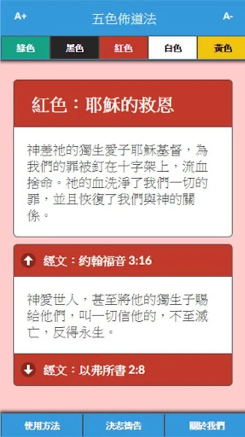 "Colored Evangelism" is a way to share the gospel, in five different colors (green, black, red, white, yellow) to express the content of the gospel, each color represents a part of the gospel.