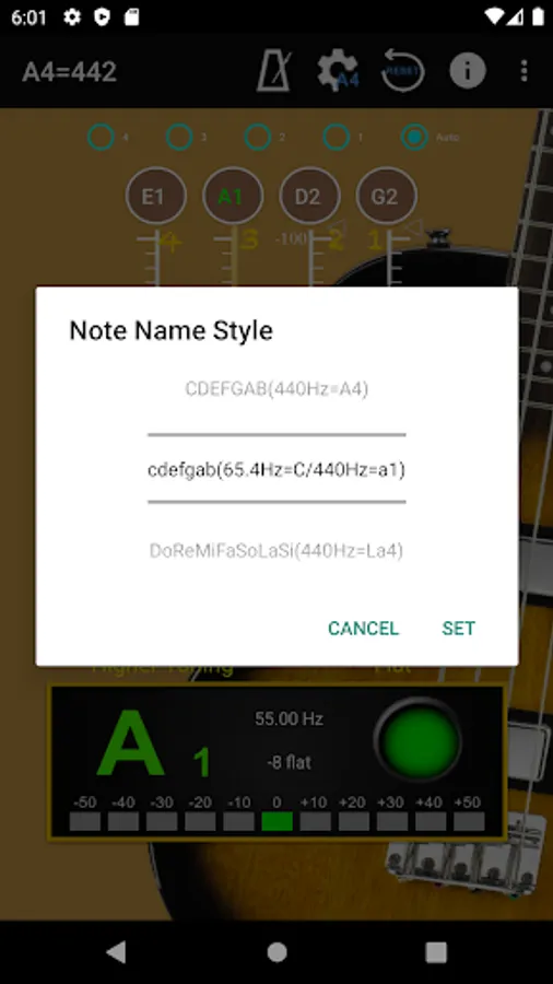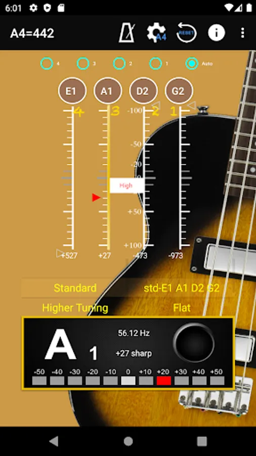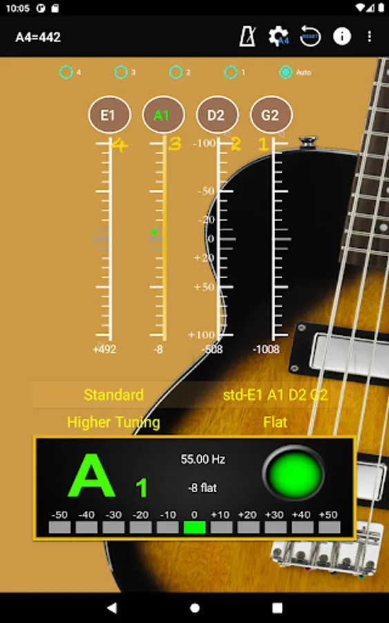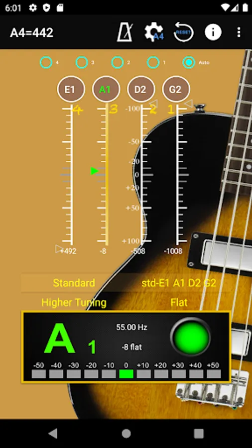 With auto noise filtering.  First step is choose the frequency at top of screen, then choose the tuning at the middle of the screen.  When you play instrument, the pitch will be shown on the panel for the individual string by indicating signal high or low.