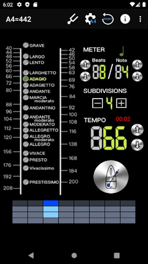 - Intuitive beat mode selection, 18 types, including: Grave 25-45 / Largo 40-60 / Lento 45-60 / Larghetto 60-66 / Adagio 66-76 / Adagietto 72-76 / Andante 76-108 / Andantino 80- 108 / Marcia moderato 83-85 /Andante moderato 92-112 / Moderato 108-120 / Allegretto 112-120 / 116-120/ Allegro 120-156 / Vivace 156-176 / Vivacissimo 172-176 / Presto 168-200 / Prestissimo 200 Bpm and over