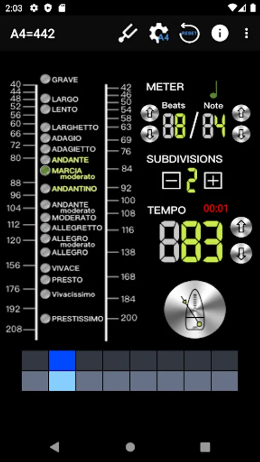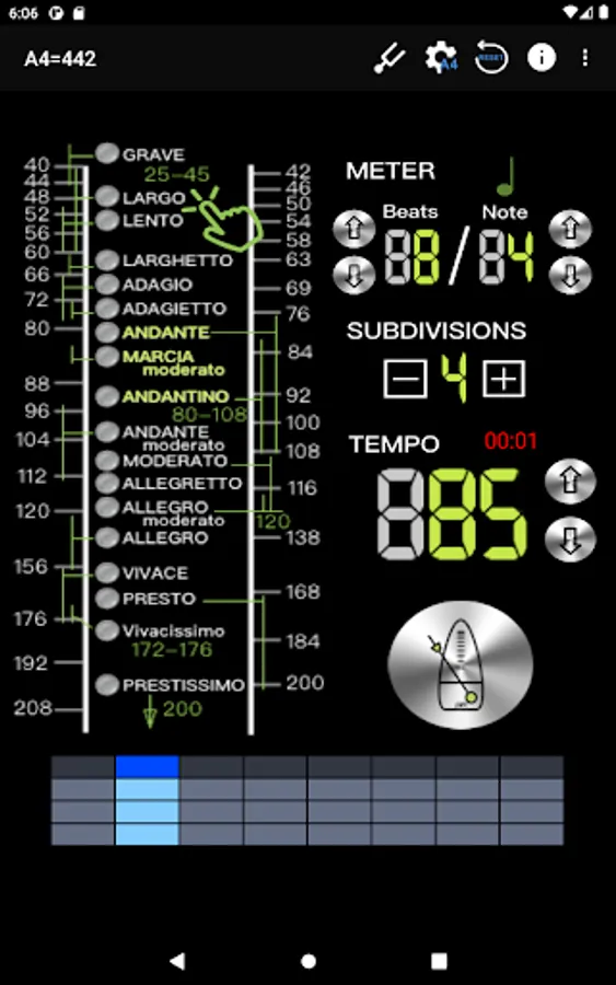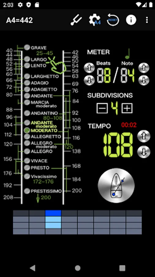 - Intuitive beat mode selection, 18 types, including: Grave 25-45 / Largo 40-60 / Lento 45-60 / Larghetto 60-66 / Adagio 66-76 / Adagietto 72-76 / Andante 76-108 / Andantino 80- 108 / Marcia moderato 83-85 /Andante moderato 92-112 / Moderato 108-120 / Allegretto 112-120 / 116-120/ Allegro 120-156 / Vivace 156-176 / Vivacissimo 172-176 / Presto 168-200 / Prestissimo 200 Bpm and over