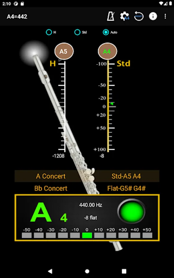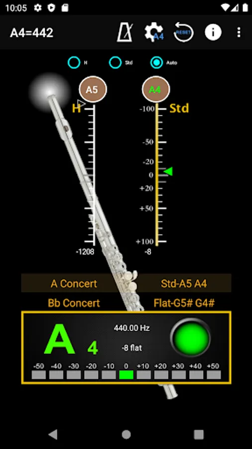 With auto noise filtering.First step is choose the frequency at top of screen, then choose the tuning at the middle of the screen. When you play instrument, the pitch will be shown on the panel by indicating signal high or low.