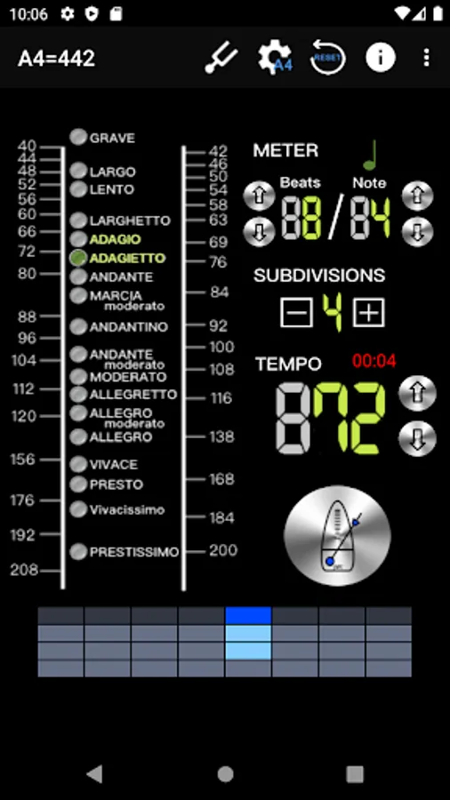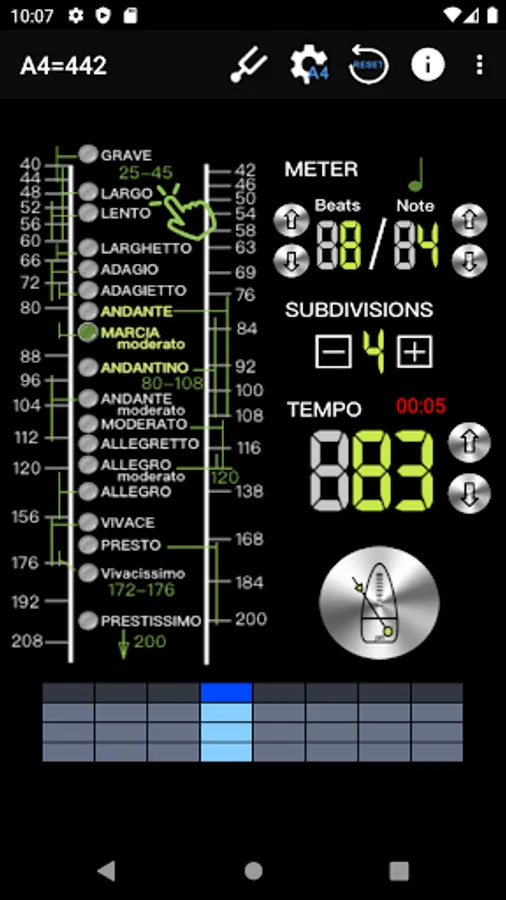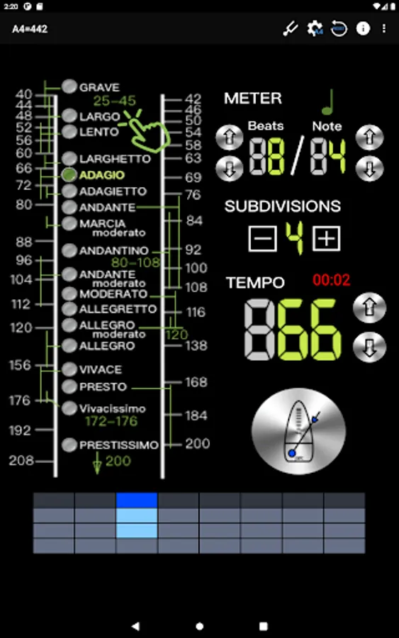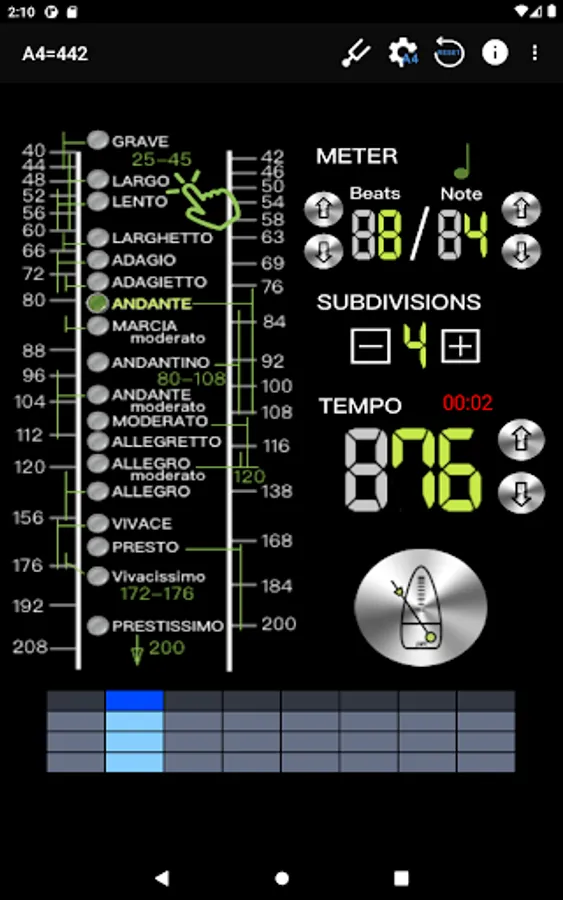 - Intuitive beat mode selection, 18 types, including: Grave 25-45 / Largo 40-60 / Lento 45-60 / Larghetto 60-66 / Adagio 66-76 / Adagietto 72-76 / Andante 76-108 / Andantino 80- 108 / Marcia moderato 83-85 /Andante moderato 92-112 / Moderato 108-120 / Allegretto 112-120 / 116-120/ Allegro 120-156 / Vivace 156-176 / Vivacissimo 172-176 / Presto 168-200 / Prestissimo 200 Bpm and over