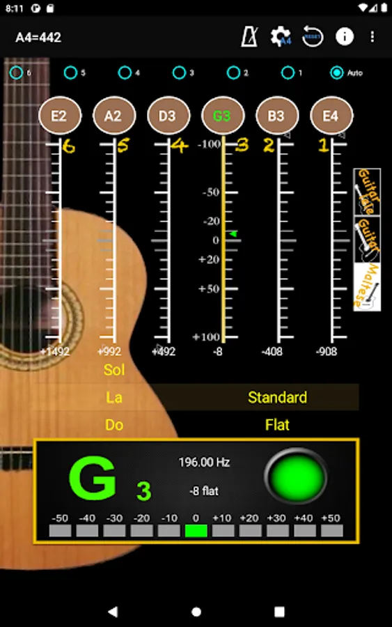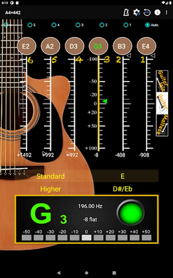 With auto noise filtering. First step is choose the frequency at top of screen, then choose the tuning at the middle of the screen. When you play instrument, the pitch will be shown on the panel for the individual string by indicating signal high or low.
