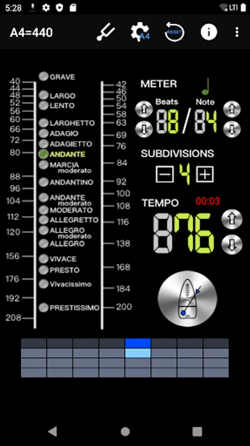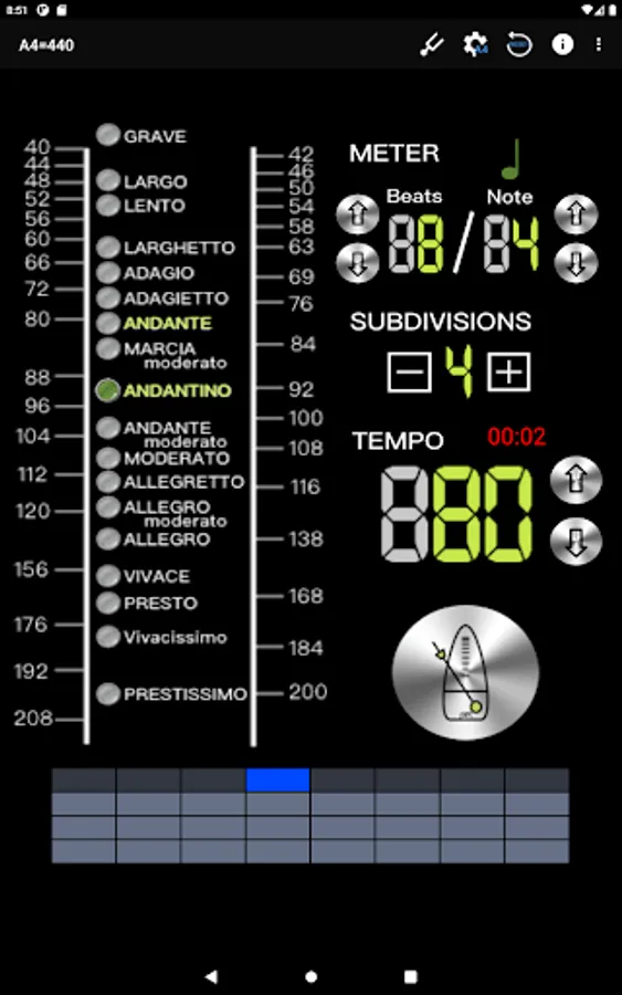 - Intuitive beat mode selection, 18 types, including: Grave 25-45 / Largo 40-60 / Lento 45-60 / Larghetto 60-66 / Adagio 66-76 / Adagietto 72-76 / Andante 76-108 / Andantino 80- 108 / Marcia moderato 83-85 /Andante moderato 92-112 / Moderato 108-120 / Allegretto 112-120 / 116-120/ Allegro 120-156 / Vivace 156-176 / Vivacissimo 172-176 / Presto 168-200 / Prestissimo 200 Bpm and over