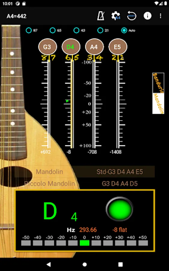 APP with auto noise filtering.  First step is choose the frequency at top of screen, then choose the tuning at the middle of the screen.  When you play instrument, the pitch will be shown on the panel for the individual string by indicating signal high or low.