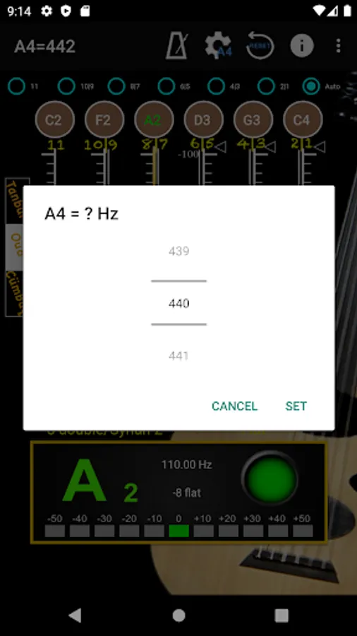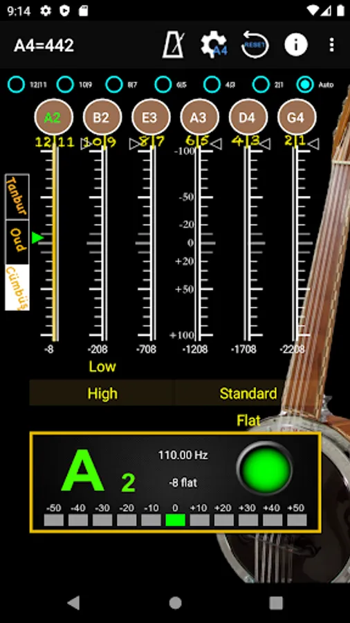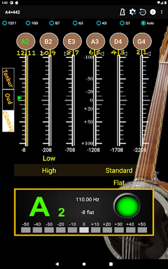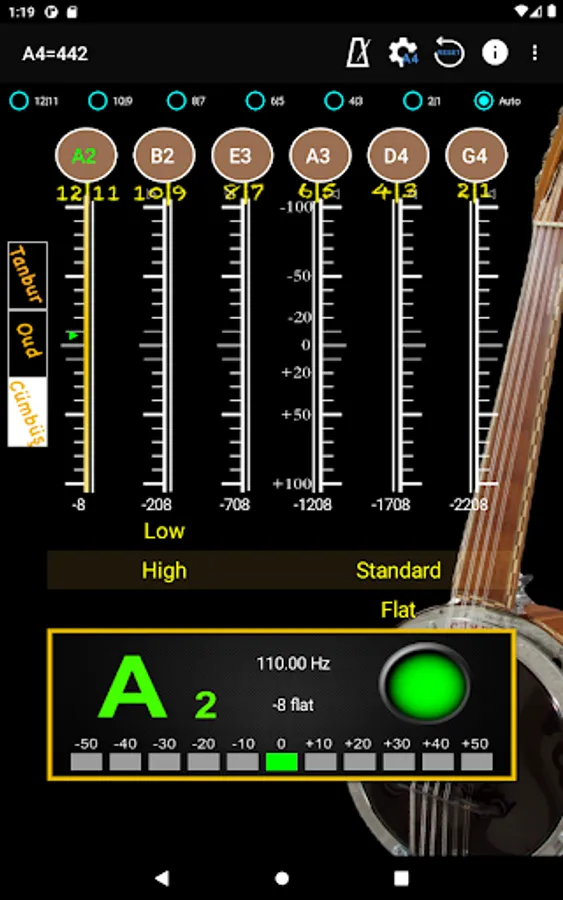 With noise filtering can help you tuning strings with simple setting while activating the APP. First step is choose the frequency at top of screen, then choose the tuning at the middle of the screen. When you pull the string, the pitch will be shown on the panel for the individual string by indicating signal high or low.