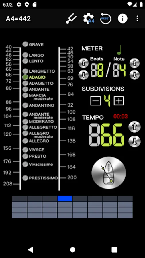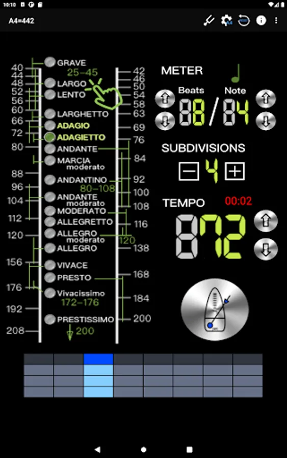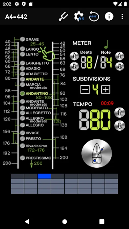 - Intuitive beat mode selection, 18 types, including: Grave 25-45 / Largo 40-60 / Lento 45-60 / Larghetto 60-66 / Adagio 66-76 / Adagietto 72-76 / Andante 76-108 / Andantino 80- 108 / Marcia moderato 83-85 /Andante moderato 92-112 / Moderato 108-120 / Allegretto 112-120 / 116-120/ Allegro 120-156 / Vivace 156-176 / Vivacissimo 172-176 / Presto 168-200 / Prestissimo 200 Bpm and over