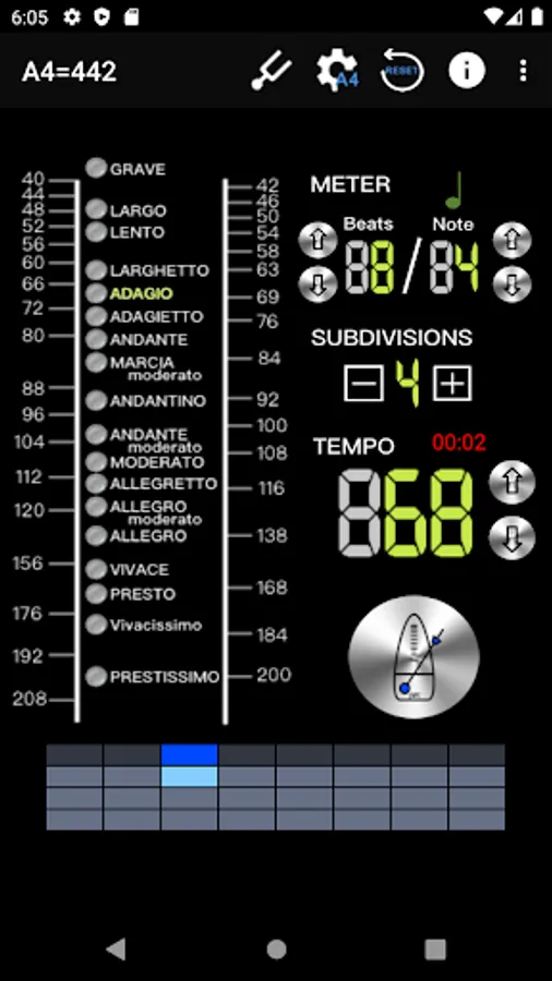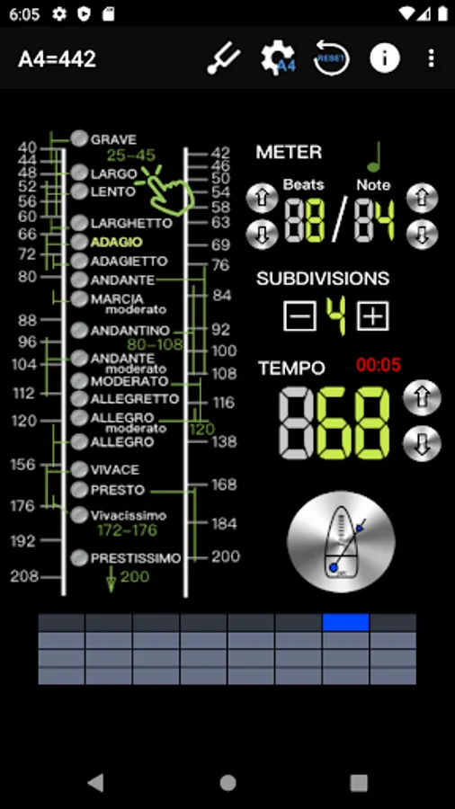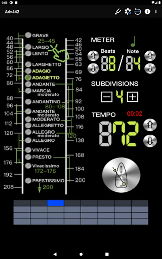 - Intuitive beat mode selection, 18 types, including: Grave 25-45 / Largo 40-60 / Lento 45-60 / Larghetto 60-66 / Adagio 66-76 / Adagietto 72-76 / Andante 76-108 / Andantino 80- 108 / Marcia moderato 83-85 /Andante moderato 92-112 / Moderato 108-120 / Allegretto 112-120 / 116-120/ Allegro 120-156 / Vivace 156-176 / Vivacissimo 172-176 / Presto 168-200 / Prestissimo 200 Bpm and over