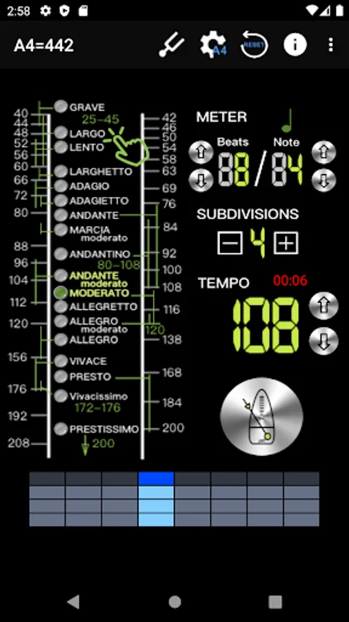 - Intuitive beat mode selection, 18 types, including: Grave 25-45 / Largo 40-60 / Lento 45-60 / Larghetto 60-66 / Adagio 66-76 / Adagietto 72-76 / Andante 76-108 / Andantino 80- 108 / Marcia moderato 83-85 /Andante moderato 92-112 / Moderato 108-120 / Allegretto 112-120 / 116-120/ Allegro 120-156 / Vivace 156-176 / Vivacissimo 172-176 / Presto 168-200 / Prestissimo 200 Bpm and over
