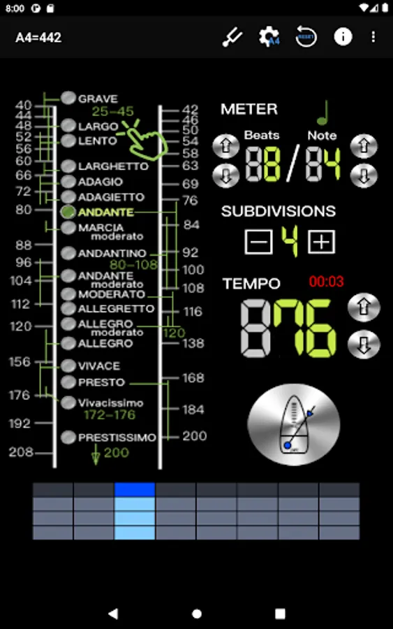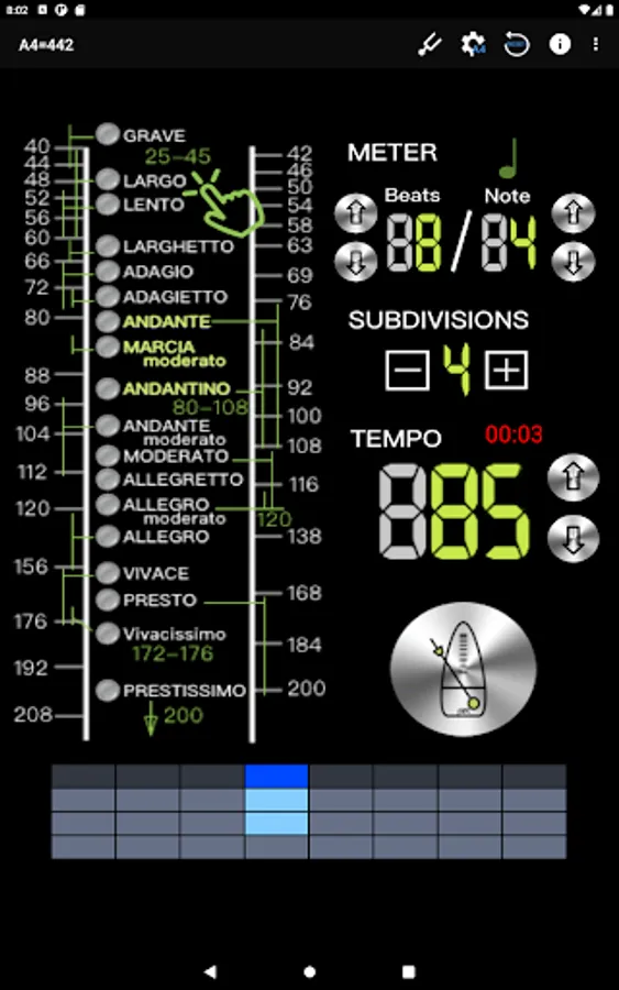 - Intuitive beat mode selection, 18 types, including: Grave 25-45 / Largo 40-60 / Lento 45-60 / Larghetto 60-66 / Adagio 66-76 / Adagietto 72-76 / Andante 76-108 / Andantino 80- 108 / Marcia moderato 83-85 /Andante moderato 92-112 / Moderato 108-120 / Allegretto 112-120 / 116-120/ Allegro 120-156 / Vivace 156-176 / Vivacissimo 172-176 / Presto 168-200 / Prestissimo 200 Bpm and over