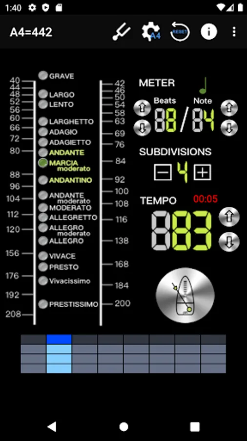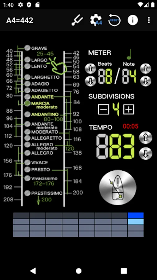 - Intuitive beat mode selection, 18 types, including: Grave 25-45 / Largo 40-60 / Lento 45-60 / Larghetto 60-66 / Adagio 66-76 / Adagietto 72-76 / Andante 76-108 / Andantino 80- 108 / Marcia moderato 83-85 /Andante moderato 92-112 / Moderato 108-120 / Allegretto 112-120 / 116-120/ Allegro 120-156 / Vivace 156-176 / Vivacissimo 172-176 / Presto 168-200 / Prestissimo 200 Bpm and over