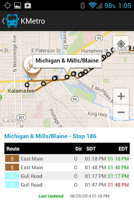 Kalamazoo Metro Transit’s “Track My Bus” app will assist with locating your bus and finding the time it will arrive at your bus stop. View real-time Kalamazoo city bus locations. See where your bus is located on it’s route.