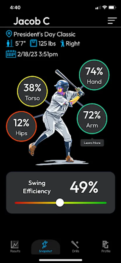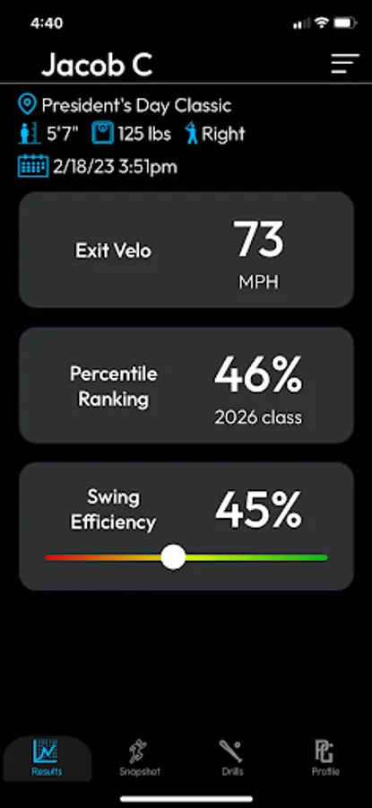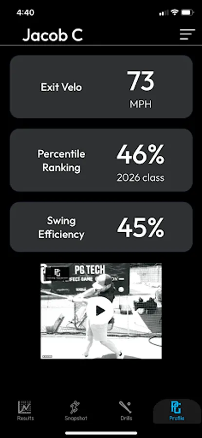 The PG Tech app helps baseball players increase their exit velo. It shows you where you rank versus other players today and where you can get with PG Tech. Find your biggest swing weakness, get targeted drills to fix it, and update your PG profile exit velo.