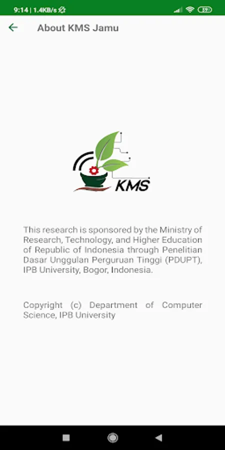KMS Jamu is an application that provides information about herbal medicines in Indonesia and disseminates the results of research on herbal medicines to the community and researchers. This research is sponsored by the Ministry of Research, Technology, and Higher Education of the Republic of Indonesia through the Leading Research Foundation for Higher Education (PDUPT), IPB University, Bogor, Indonesia.